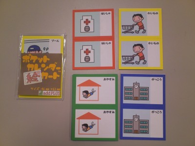 おすすめポイントその@表裏に印刷があり、1か月の予定を便利に管理できます。おすすめポイントそのA学校はブルー枠、おやすみは緑枠、病院は赤枠など色分けされています。おすすめポイントそのBオリジナル絵カードの右横のスペースでカレンダーを更に充実。(付箋や小さな紙で、行先やヘルパーさんの顔写真や待ち合わせの時間など情報を書き足すことが出来ます。)大人気の【ビニールポケットカレンダー】(税込み価格2675円)と組み合わせるとこのような感じに出来上がります♪