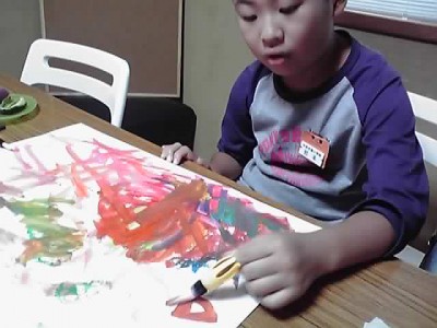 慎重派のYくんは、スポッと指に筆をはめて・・・サラサラと描き始めました。