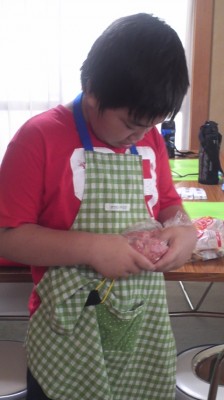 ミンチをこねる工程では、お肉を触るのがちょっと苦手だったようでした。