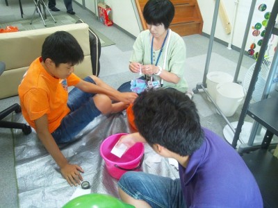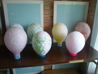 風船に何重にも半紙を貼り付けていき、作品を作りました。